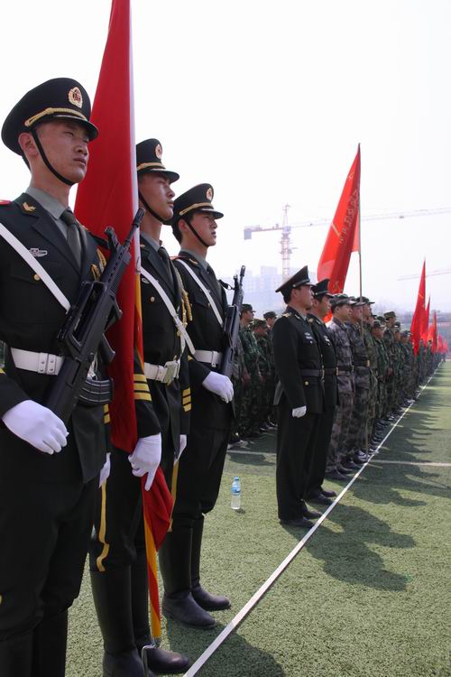 上午10時,點驗大會在嘹亮的軍歌聲中拉開序幕。預(yù)備役官兵軍容嚴整,雄姿勃發(fā),精神抖擻,士氣高昂,充分展示了當(dāng)代預(yù)備役軍人的良好精神風(fēng)貌,展現(xiàn)了部隊良好的軍政素質(zhì)和優(yōu)良的戰(zhàn)斗作風(fēng)。3名儀仗隊員護衛(wèi)著軍旗,邁著矯健的步伐從主席臺南側(cè)走到隊列北側(cè)。1500余人的預(yù)備役軍人身著整齊的軍裝,按照各自編制,在操場排成整齊的方隊,接受了首長的檢驗并進行了宣誓儀式。點驗結(jié)束后,預(yù)備役官兵進行了擒敵拳、盾牌警棍術(shù)和防爆隊形等三個科目的匯報演示。通過集結(jié)點驗,鍛煉提高了團首長機關(guān)和營連各級指揮員的組織協(xié)調(diào)能力,探索研究了組織全團集結(jié)點驗的方法路子,錘煉了部隊,強化了作風(fēng),有效提高了部隊快速動員和隨時應(yīng)召的能力。