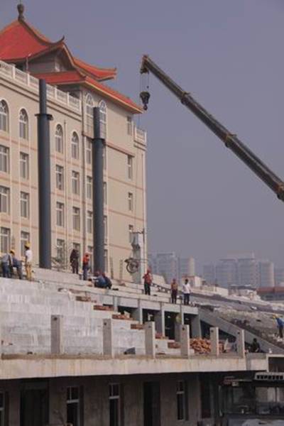 圖3為繁忙的看臺吊裝施工的場景
